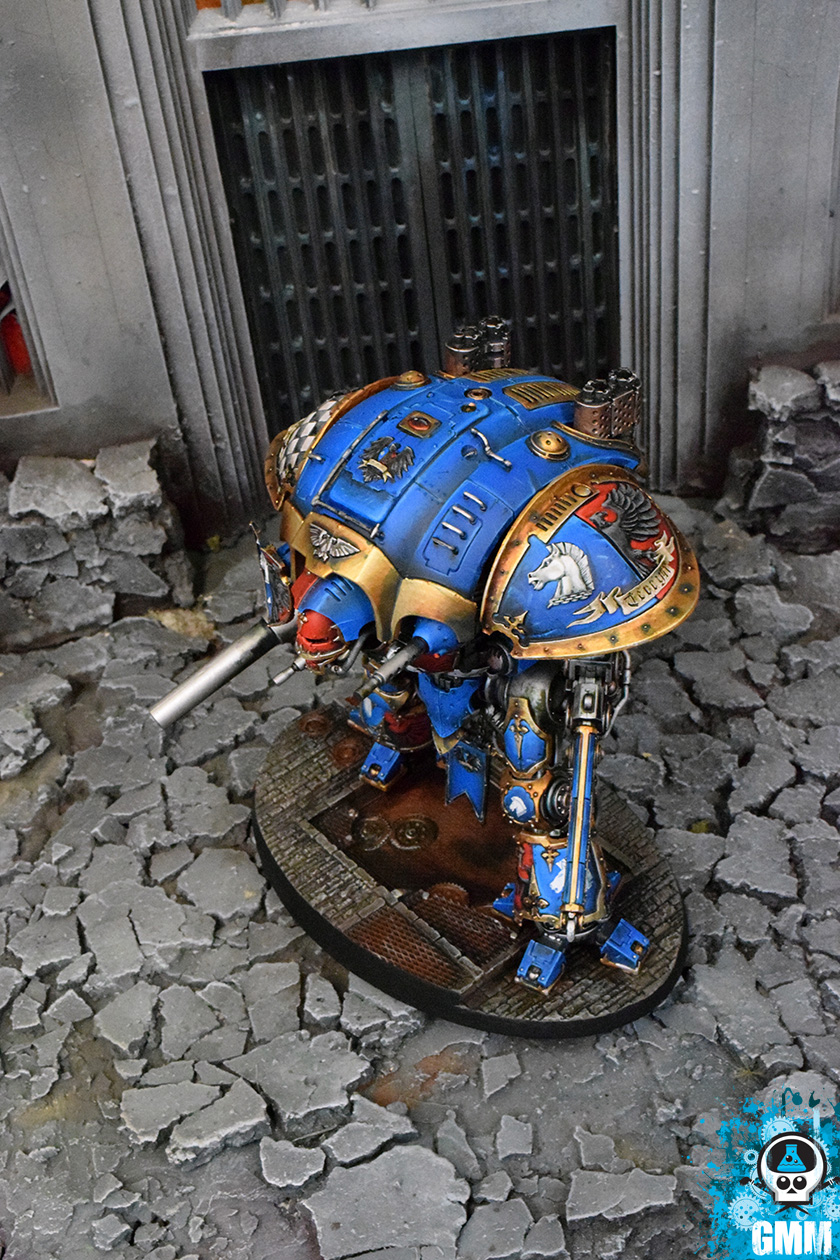 With the overview posted, time to go into each individual set of Knights. First is batch one of two House Terryn. These feature the upgrade kits, couple of Forge World Knights and Dragon Forge bases. Lots of freehand alongside a smooth shade of blue - all shading, blended highlighting and weathering hand painted over solid basecoats. The Acheron is a gifted Knight from the Mechanicum, blending the iconography of both together.