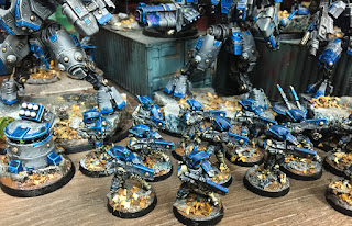 Anyway. Round two of a set of Tau I did last summer in blue and grey. The last set was the essentials, so this one is all of the new releases and some more really big kits. All really nice models that painted up well, especially the big guy. A new custom Farsight made up of a few kits, and scratch built basing. I have fun painting anything, but the square panels of Tau are always extra enjoyable and get along well with my style of hand shading and highlighting.